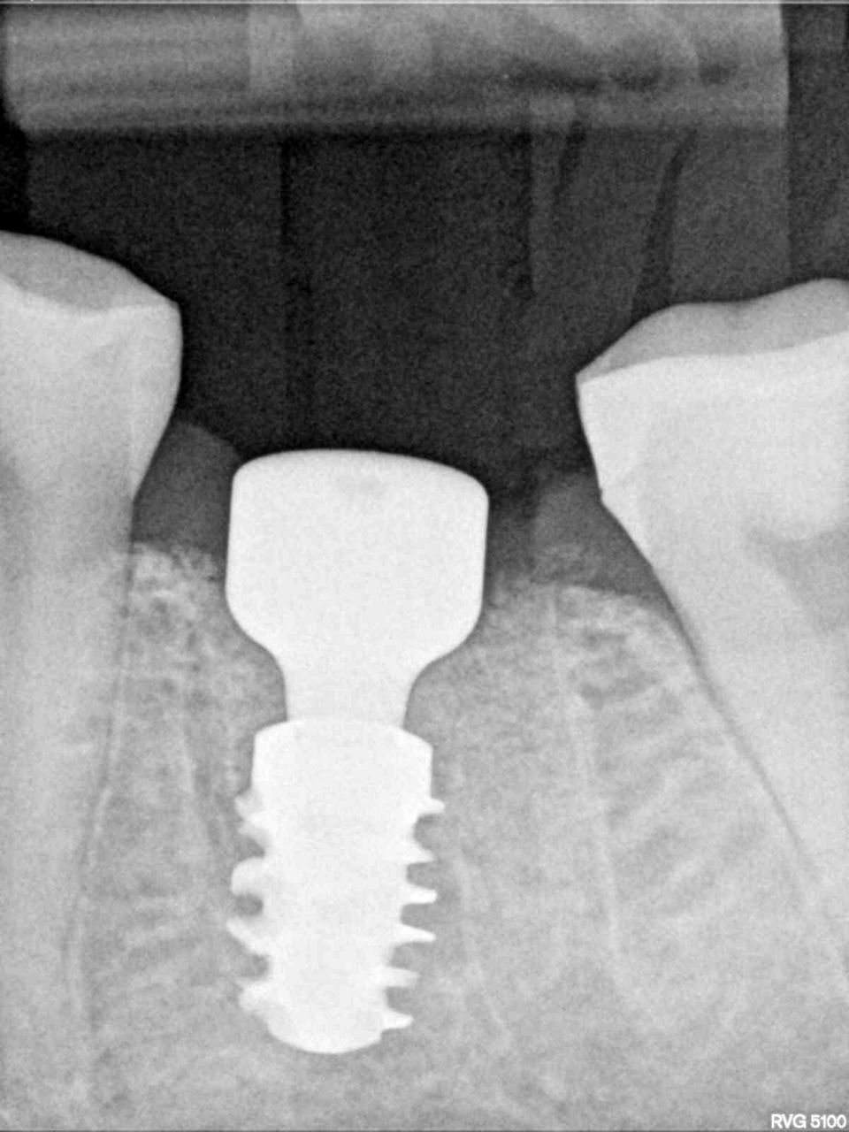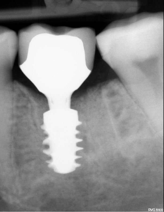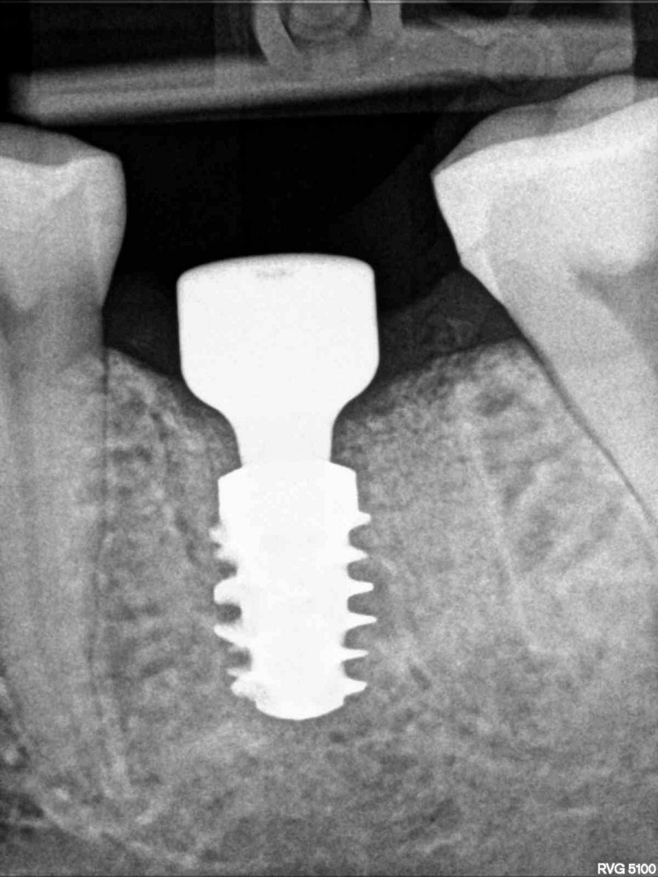 #36牙的治疗非常成功,没有出现任何并发症。患者对功能和美观感到满意。她被告知种植体周围应保持适当的个人卫生,以及每 6 个月进行一次检查和专业口腔卫生的必要性。